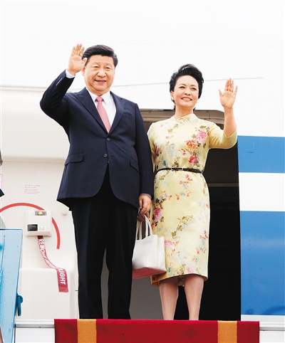 11月5日,中共中央总书记、国家主席习近平抵达越南首都河内,开始对越南进行国事访问。这是习近平和夫人彭丽媛步出舱门向欢迎人群挥手致意。 新华社记者 李学仁 摄