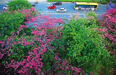 11月8日,在海口市秀英大道,盛开的美丽异木棉满树繁花,色彩鲜艳。据了解,美丽异木棉树又称“美人树”,是木棉科异木棉属的落叶乔木,原产于南美洲。本报记者 张茂 摄