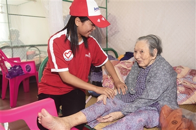 志愿者向敬老院赠送了一台电冰箱,给每一位老人穿上新买来的风衣。然后分头将庭院打扫干净,动手为老人包饺子、煮热粥,并带来用具为老人制作蛋糕……让孤寡老人冬日感受到春天般的温暖,图为一名安利志愿者在为孤寡老人按摩。