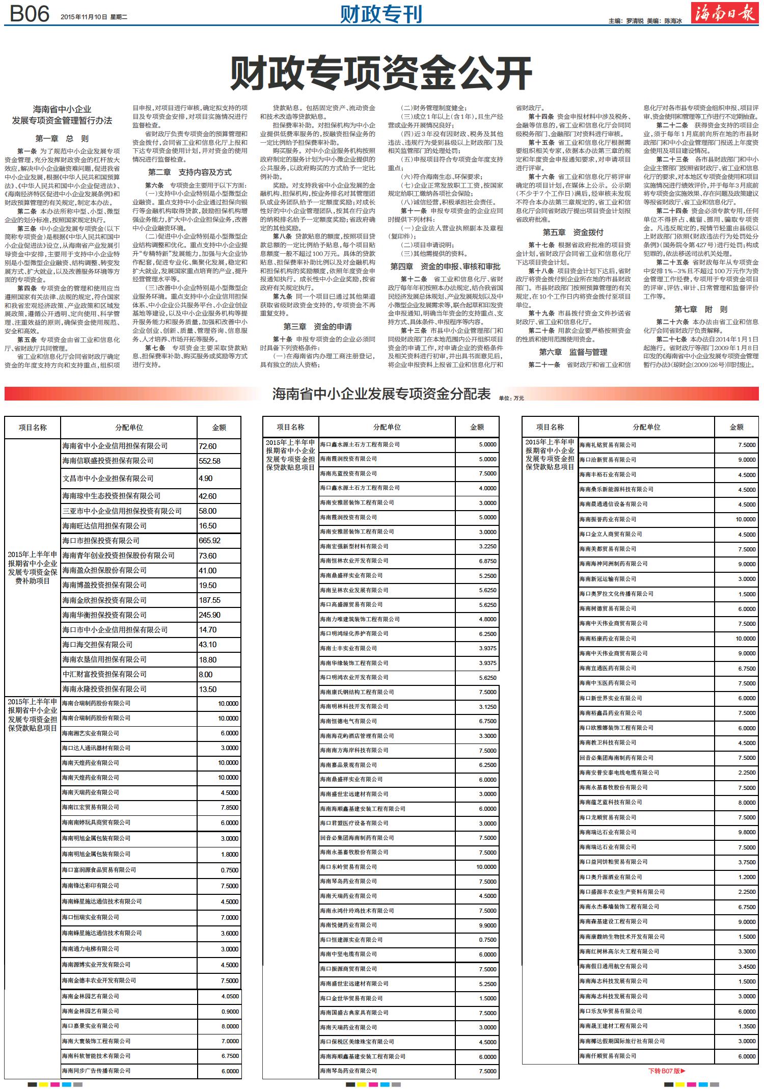 海南省中小企业发展专项资金分配表