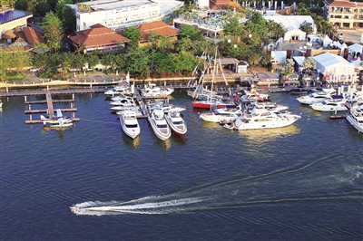 三亚河入海口处,鸿洲埃德瑞游艇码头里的海天盛筵国际游艇展览。水木 摄