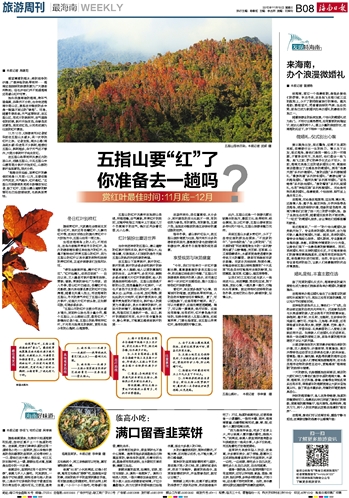 ■ 本报记者 易建阳湛蓝清澈的海水、柔软洁净的沙滩、广袤神秘的热带雨林……海南这些独特的旅游资源为广大游客所熟知。但也许他们并不知道海南还有满山红叶可赏。