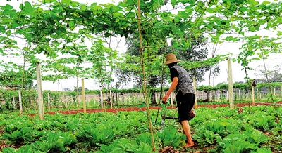 11月20日,海口市龙华区遵谭镇咸谅村农民采用立体式方法种植蔬菜。据介绍,这种佛手瓜与叶菜套种的方式有效利用种植面积,提高了生产效率。