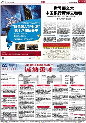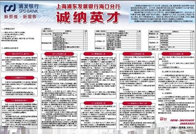上海浦东发展银行成立于1992年,总部设在上海,是具有强大综合竞争力的全国性股份制商业银行。2015年,英国《银行家》杂志发布“全球银行1000强”排名,浦发银行核心资本排名全球第35位,居上榜中资银行前列。浦发银行海口分行成立于2013年6月, 是总行直属的省级分行。开业以来,分行秉承“合规、稳健、创新”的办行理念,一直倡导“以人为本、企业与员工共成长”的用人理念,致力于营造积极向上、活泼乐观、团结合作的企业文化氛围,为员工施展才华提供广阔的空间与和谐的内部环境,帮助员工构建职业生涯规划。