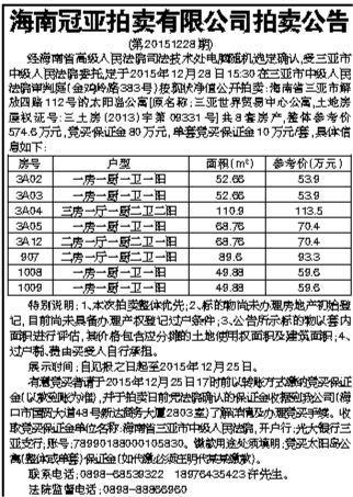 海南冠亚拍卖有限公司拍卖公告
