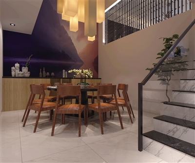 设计说明:通往一楼餐厅区的楼梯间动感线条,彰显开阔敞朗的格局气势。一整面长幅山水画作,将内外界线隐于无形,且透过此景,绿篱、植栽仿佛定格。优雅而宁静的色调、舒适的空间质感,温情地涤荡你归家时的疲惫。