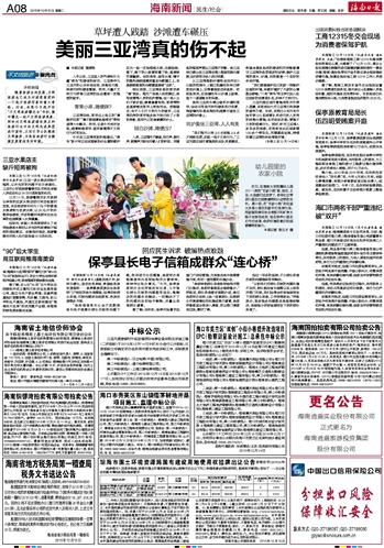 近日,在海南大学附属幼儿园小(一)班的“农家小院”里,地瓜、土豆、大蒜都已经发芽了,老师们正带领小朋友们观察植物和小动物的生长。据介绍,该“农家小院”的花盆大多是小朋友和家长们变废为宝,用家里的废旧洗衣液瓶子和矿泉水瓶子改装而成的,旨在培养小朋友们节约资源、保护环境的意识和观察事物的能力。