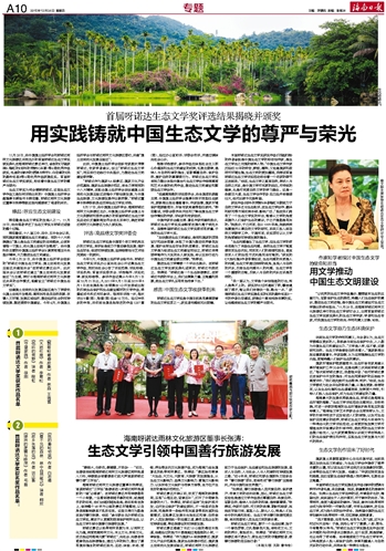 推进生态文学需要一个平台去展示。在呀诺达生态文学奖颁奖典礼结束后,呀诺达书院成立。张涛说:“呀诺达是一个生态旅游景区,在呀诺达书院的平台上,我们会集聚力量、正能量和资源,把生态文学扎实有效地传承下去。”