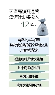“澄迈还重点把旅游区布局在西环高铁周边,比如澄迈福山咖啡文化风情镇、地中海风情小镇等四大风情小镇。”杨思涛说,待环岛高铁开通后,澄迈计划将投入12亿元,建设小火车项目,将高铁沿线的福山咖啡风情文化镇、地中海风情小镇、台湾风情小镇以及欧洲文化风情小镇串联起来,游客可以坐高铁到福山站再转轨到小火车,乘坐小火车观光游览四个风情小镇。