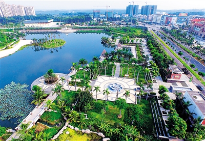 儋州城区生态环境优美。图为儋州市龙门路棕榈岛公园。 袁才 摄