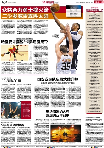 据新华社华盛顿2015年12月31日电 美国男子职业篮球联赛(NBA)31日进行了6场常规赛,库里继续缺阵的金州勇士队凭借着汤普森的精准投射,以及其他队员的齐心协力,以114:110力克休斯敦火箭队,而拥有韦斯特布鲁克和杜兰特的俄克拉荷马雷霆队则凭借着“二少”的出色表现以110:106击败菲尼克斯太阳队。尽管当家球星库里继续因伤缺席,勇士队依然有汤普森这样的王牌球员和格林这样的好手,汤普森以全场38分,其中包括6个3分球的惊艳表现率领勇士取胜,而格林在比赛中则拿下三双,他不但夺得10分和11个篮板球,还有其职业生涯单场最高的16次助攻。
