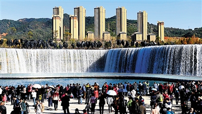 1月2日,游人在新建成的昆明瀑布公园参观游览。 近日,位于云南省昆明市北部山水新区的昆明瀑布公园建设完工并免费向市民开放。该公园于2013年开工建设,总投资约11亿元,是牛栏江——滇池补水工程的重要配套工程。公园的瀑布景观区充分利用牛栏江引水入滇工程而形成人工瀑布及湖泊,其利用约12.5米的地势高差,建设成宽幅约400米的人工瀑布。新华社发