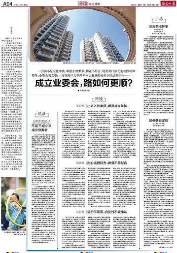 以上可以看出,有没有业主委员会,小区的境遇大不一样。然而,记者在采访中发现,如何让组织涣散的小区业主拧成一股绳,让成立、运行都困难重重的业委会遍地开花,依然是一个难题:由于小区空置率高、申报手续繁多严格、部分业主参与不积极等原因,所有小区的业委会均面临着艰难成立过程,成立后的业委会行使职责的路也并不是一帆风顺,组织内部分歧不断、维权面临的阻力依旧不小……