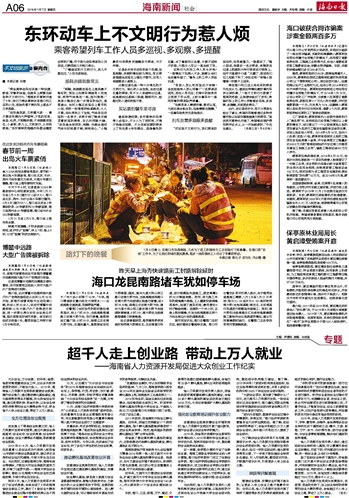 此外,在记者采访中,有不少乘客也给出了建议,希望列车能够通过多种传播手段以及惩罚措施强调文明乘车。“现在西环高铁也开通了,希望能在维护乘车秩序这点上,从一开始就做好。”牛先生建议。(本报三亚1月6日电)