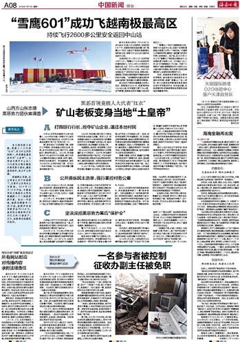 新华社南极长城站1月9日电(记者朱基钗)记者从中山站获悉,当地时间9日下午,我国首架极地固定翼飞机“雪鹰601”成功飞越位于南极冰盖最高区域的昆仑站,持续飞行2600多公里安全返回中山站。当地时间9日13时31分(北京时间16时31分),“雪鹰601”从中山站附近的冰盖机场起飞,飞行4小时23分后成功飞越昆仑站上空,飞行9小时4分钟后返回中山站,持续飞行2623公里。此次飞行全面验证了飞机的动力系统、控制系统、续航能力和适应南极高原环境复杂条件的技术性能。飞机搭载的多套先进科学设备也获得了具有重大价值的科学数据。