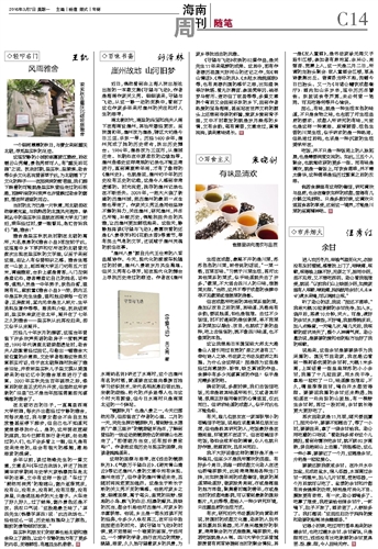 近日,偶然看到由上海人民出版社出版的一本散文集《守望与飞动》,作者是海南作家关义秀。细细读来,守望与飞动,从这一静一动的变换中,看到了这位作家多年来对崖州的关注和对人生的思考。南北朝时代,南梁的冯宝和冼夫人南下在海南设崖州,其治所屡经更改。至民国初年,崖州改为崖县,辖区大约是今日三亚、乐东一带。历经1400余年,崖州完成了她的历史使命,淡出历史舞台。1984年,崖县改为三亚市,从崖城迁走。长期处在中原政权的边缘地带,崖州连修史这样常规的记录也不能正常进行,直到清康熙年间,才有了像样的《崖州史》。也就是说,崖州约千年的历史没有正史的记载,这是令人感到非常遗憾的。时光流逝,残存的崖州记录也在不断丢失。2005年,一把大火烧了新建的古崖州城,把古崖州的最后一点念想也带走了。作家关义秀正是用他坚持不懈的努力,关注崖州,研究崖州,并尽己所能,补缀历史,偶能找回失去的风雅,让古崖州更加鲜活起来。这些天,静静地阅读《守望与飞动》,最喜欢看的还是《八景寻芳》和《花韵水香》等章节,带有泥土气息的文字,述说赋于崖州灵魂的前尘往事。