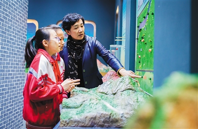 3月17日,工作人员在内蒙古呼和浩特市玉泉区地震科普馆为小学生讲解地震震级和烈度知识。 当日,由呼和浩特市玉泉区地震局建设的地震科普馆正式开馆。科普馆位于玉泉区通顺街小学校园内,展出内容包括地震地质模型、地球构造模型、地震过程演示、建筑结构抗震技术体验、防震避险科普等,人们可通过参观体验,了解地震起因及防震知识,提高防震减灾意识和技能。