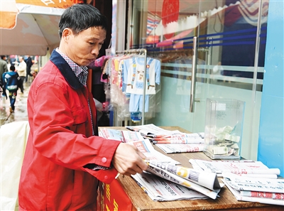 3月17日,龙兴添在广西南宁市伶俐镇街头的“无人报摊”清点报纸。 广西南宁市伶俐镇街头的“无人报摊”从2013年4月开办以来,平均每天售出报纸100多份,近3年来已售出10多万份报纸,极少有丢失的情况。 “无人报摊”的主人,是伶俐镇报刊发行站工作人员——龙兴添。龙兴添2001年开始在伶俐发行站工作。起初,他需要背着背包四处卖报。除了伶俐,周边的长塘、南阳等村镇也都属于他的发行范畴。原本他有间书店在这个“无人报摊”的对面,卖书也卖报。可渐渐地,他发觉图书不好卖,而且照看书店还需要人手。自己派送报纸工作忙,只能把看店的事情交给妻子,后来干脆就把书店关门了。 2013年4月,他在报刊摊摆上收钱的盒子,开始了无人售卖的“诚信买卖报刊”模式。每天早上摆好报纸后,就出去送报,送完自己负责的发行区的报纸后,再来“无人报摊”清点。新华社记者 周华摄