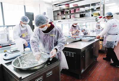 3月17日,工作人员在“盒马外卖”的中央厨房内配餐。 新华社记者 裴鑫 摄