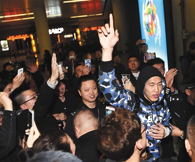 图为郭艾伦(右)在沈阳桃仙国际机场被球迷簇拥。郭艾伦手部缠着绷带。新华社发
