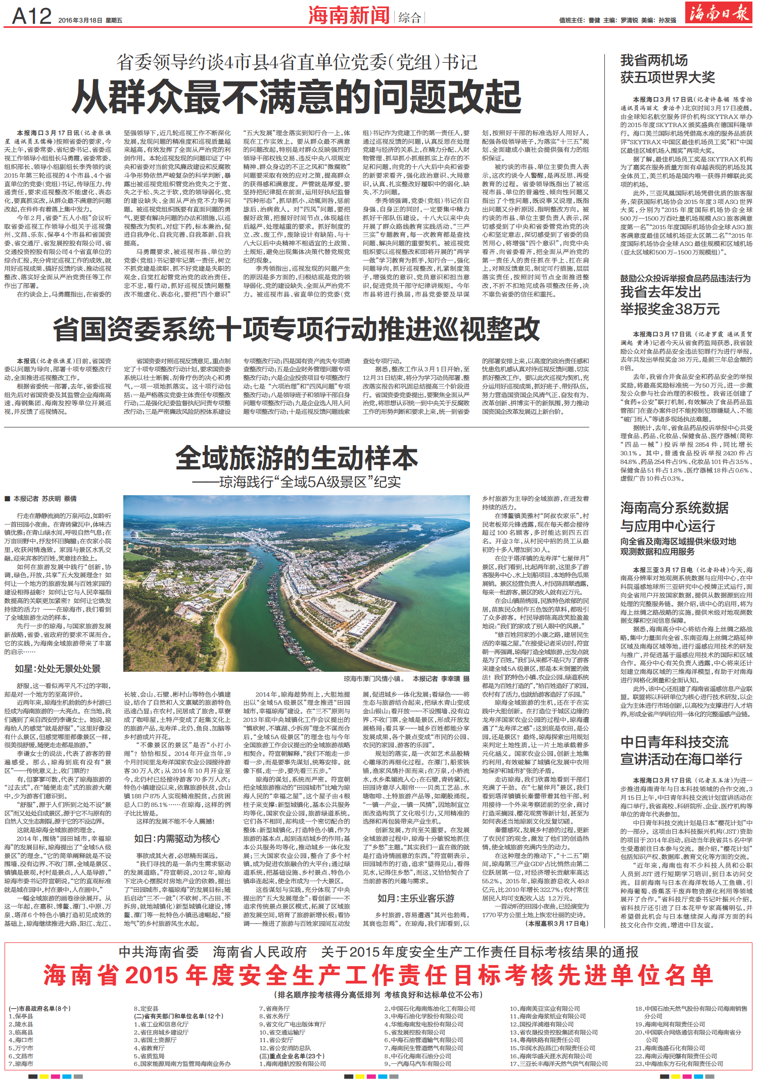 海南省2015年度安全生产工作责任目标考核先进单位名单
