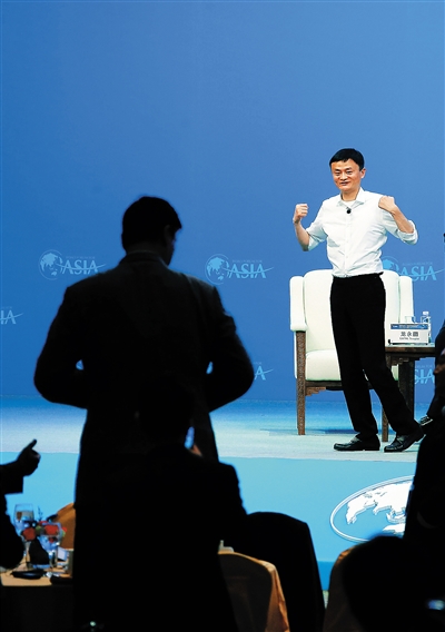 ⬆ 3月23日,论坛年会主题午餐会结束后,马云和姚明两“巨头”在互相打招呼。 本报记者 张杰 摄