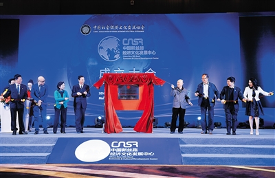 3月23日,嘉宾们共同为新丝路经济文化发展中心揭牌。当日,由中国经济文化交流协会与中国中信集团公司共同发起成立的中国新丝路经济文化发展中心在北京成立。发展中心将为中国企业和“一带一路”周边国家及地区企业,搭建一个沟通合作的战略平台,促进文化交流与经贸往来。 新华社记者 金良快 摄