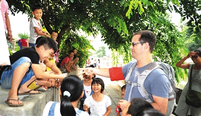 美国教师Ken在海口街头与孩子们玩起了英文版的石头剪子布游戏。本报记者 苏建强 摄