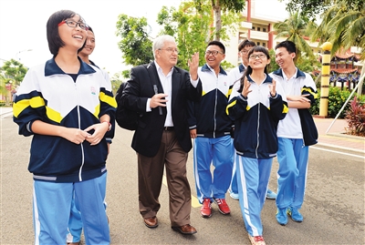 2014年11月21日,文昌中学的学生们与来访的美国华盛顿州斯特莱库姆市的市长罗恩·卢卡奇轻松交流。本报记者 王凯 摄