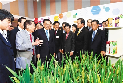 在农业与减贫合作展区,中国“杂交水稻之父”袁隆平院士向各位领导人介绍了现场展出的最先进的杂交水稻品种,并结合有关国家领导人关心的气候条件、土壤环境等做了讲解。看到湄公河国家领导人对中国水稻品种表现出浓厚兴趣,李克强高兴地说,要让中国杂交水稻“走出国门”,助力澜湄国家成为“世界粮仓”。