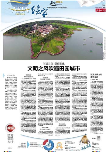 “我们建设美丽乡村和文明生态村,就是在描绘一幅美丽的山水画。一个个小镇就像一颗颗珍珠,以各种优美的姿态、优雅的风情镶嵌在美丽田园之中,一片片美丽的村庄散落在小镇四周,一间间质朴的民居掩映在绿荫之下,一条条绿道将城市、小镇和村庄连成一体,使城乡边界越来越模糊、城乡生活品质越来越接近、城乡百姓幸福指数越来越提升。百姓和游客都说,美丽乡村建设使琼海成为百姓的幸福家园,成为中外游客的度假天堂。”琼海市委书记符宣朝说。