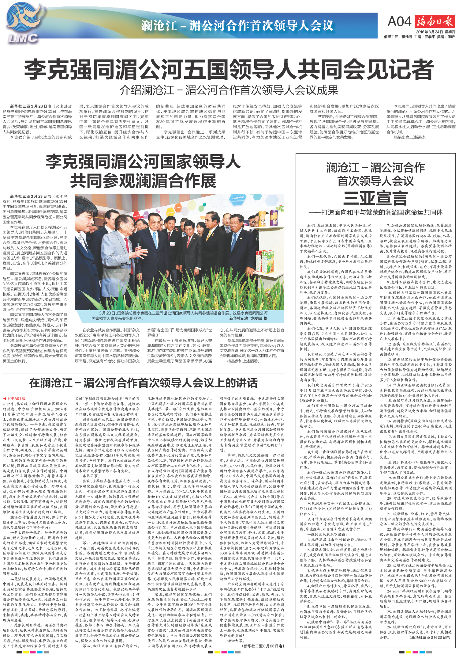 澜沧江-湄公河合作 首次领导人会议三亚宣言
