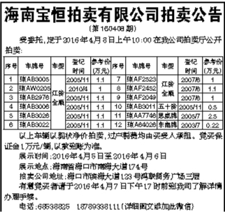 海南宝恒拍卖有限公司拍卖公告