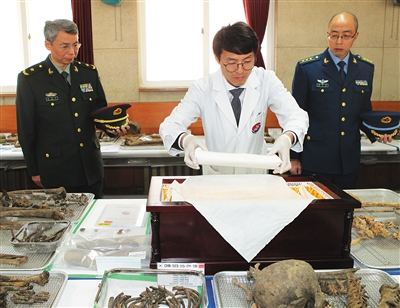 3月28日,在韩国京畿道坡州市,韩方工作人员装殓中国人民志愿军烈士遗骸。 中韩双方28日下午在韩国京畿道坡州市启动2016年在韩中国人民志愿军烈士遗骸装殓工作。据悉,此次共36具志愿军烈士遗骸及有关遗物于2015年在韩国京畿道涟川郡、铁原郡等朝鲜战争激战之地被发掘。根据中韩双方磋商达成的共识,韩方将于31日向中方移交第三批志愿军烈士遗骸及相关遗物。 新华社记者 姚琪琳 摄