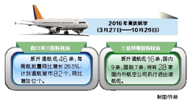 凤凰机场方面,新航季新增16条国内外航线,其中国内航线9条,国际航线7条。将有28家国内外航空公司执行三亚进出港航线,包括海南航空、南方航空、中国国际航空、东方航空、香港航空、港龙航空、胜安航空、马印航空等。