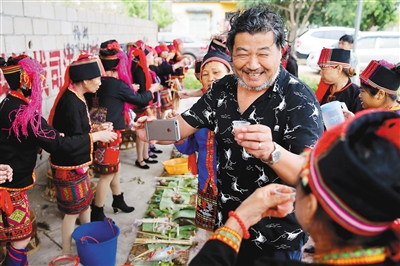 日前,美国现代传播集团公司艺术总监兼导演王星军,慕名来到昌江黎族自治县水富村体验黎族长桌宴。