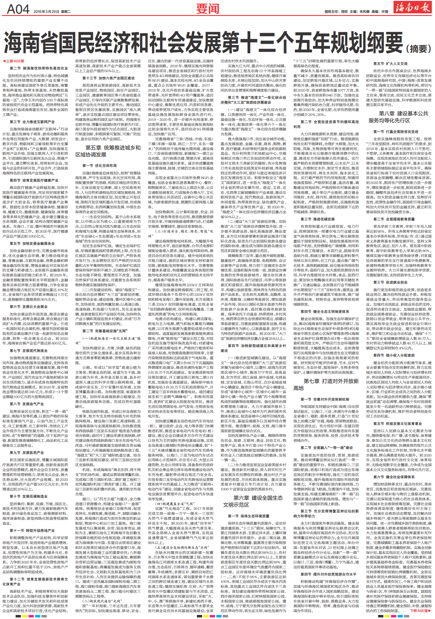 海南省国民经济和社会发展第十三个五年规划纲要(摘要)