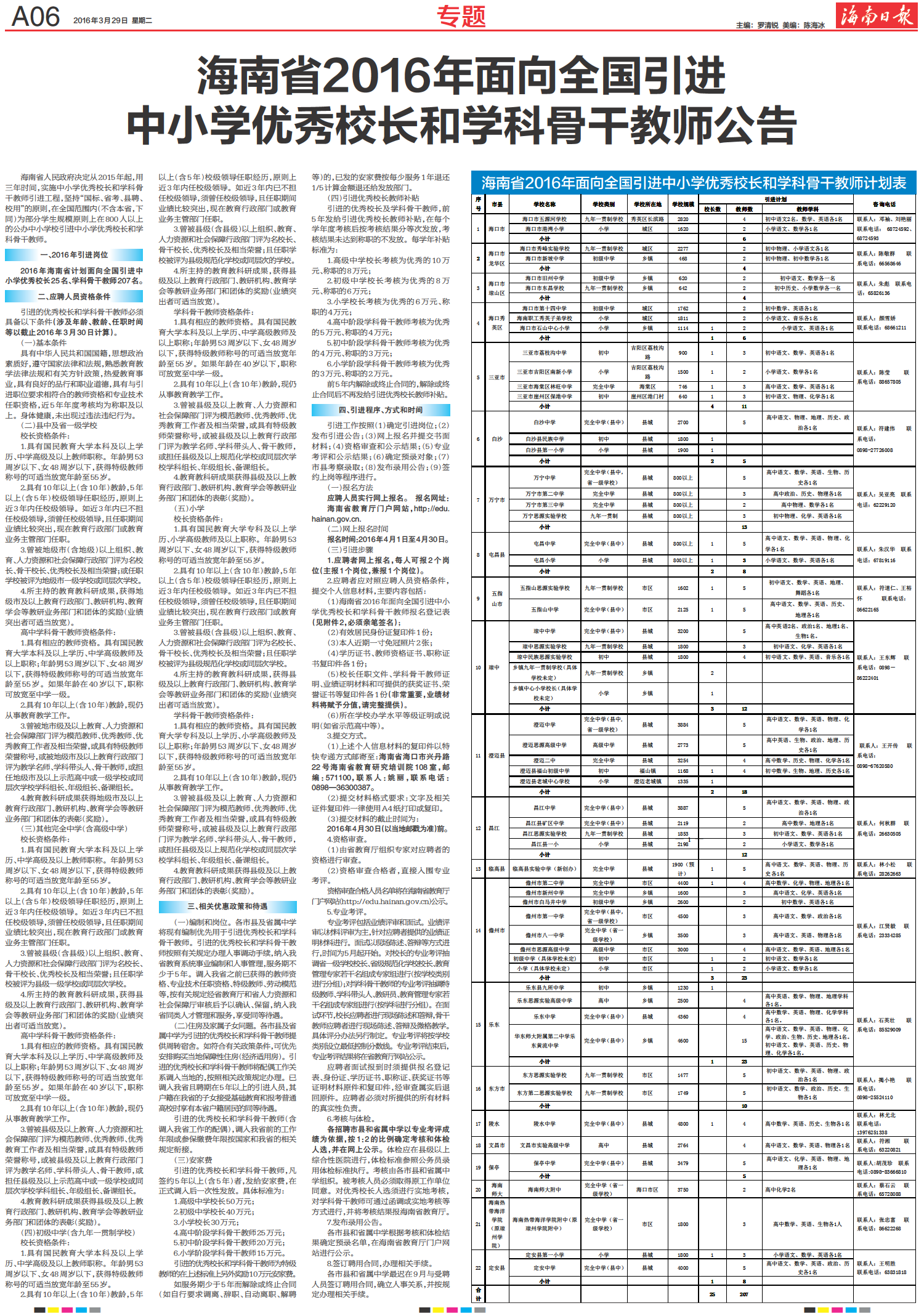 海南省2016年面向全国引进 中小学优秀校长和学科骨干教师公告