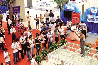 图为现场的微信红包摇一摇活动让许多观展者拿着手机聚精会神摇红包。