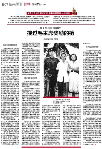 “见到毛主席真是意外的惊喜,我们一点准备都没有。”何国雄至今还记得,突然被告知中央领导要在中南海怀仁堂接见他们时的兴奋劲,“当时参加合影的代表有几千人,领导们坐在前排中间,我们海南的代表团被安排在了主席的正后方。”为了表彰女子军在中国革命斗争中的功绩,毛泽东主席亲手授予了冯增敏1支苏式自动步枪、100发子弹和学习笔记簿3本。“热泪盈眶,激动得一句话也说不出来。”何国雄清楚地记得接过毛主席手中的枪时冯增敏的表现。