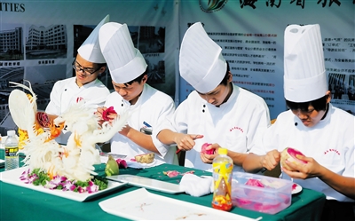 5月6日,在省歌舞剧院广场,参加省“职业教育活动周”活动的学生展示菜蔬雕花技艺。 本报记者 张茂 摄
