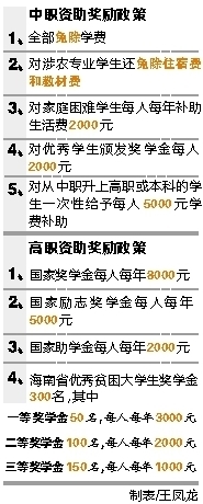 贯彻中央精神,结合我省实际,进入中职院校就读的学生全部免除学费,涉农专业的学生还免除住宿费和教材费。优秀学生颁发奖学金每人2000元,家庭困难学生每人每年可获得补助生活费2000元,从中职升上高职或本科的学生可一次性获得每人5000元学费补助。进入高职院校就读的学生则可以享受国家奖学金、国家励志奖学金、国家助学金、海南省优秀贫困大学生奖学金等资助奖励政策。