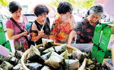5月8日,海口市民在海口明珠广场“粽爱一生”儋州粽子宣传推广季启动现场品尝、购买粽子。 苏晓 张琳 摄