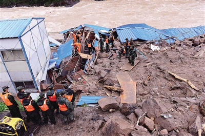 武警、消防官兵在泰宁县开善乡山体滑坡现场展开搜救。新华社发