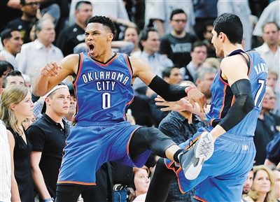 北京时间5月11日,在NBA季后赛中,马刺主场以91:95不敌雷霆。雷霆以3:2领先拿到赛点。图为雷霆球员威斯布鲁克庆祝得分。新华社发