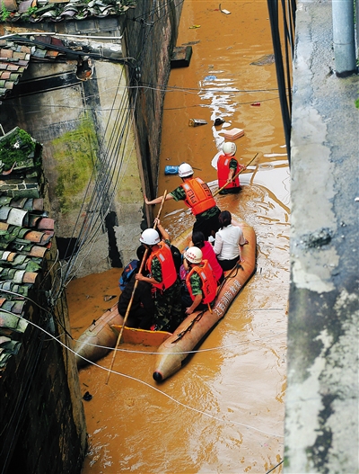 日前,江西黎川山洪暴发,消防官兵在转移受灾群众。 新华社发(万丽敏 摄)
