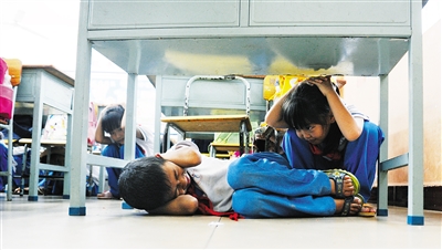 海口市秀英区永兴中心小学开展防震演习。 建强 摄