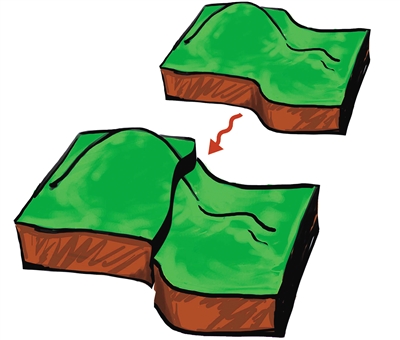 构造地震 由于地下深处岩层错动、破裂所造成,这类地震发生次数最多,破坏力也最大