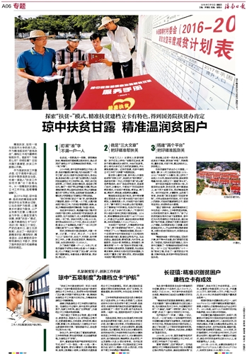 自2014年起,琼中县委、县政府把精准脱贫贯穿经济社会发展全过程,以生态保护为前提,以富美乡村建设为载体,以产业发展为支撑,以整合资金为手段,以基层党建为保障,探索“扶贫+”模式,认真开展建档立卡“345”活动(即:落实三个到位,严把四道关口,建立五项制度),走出了一条扶贫对象精准识别、精准帮扶、精准退出、动态管理的琼中特色建档立卡路子,受到了国务院扶贫办和省委省政府的肯定。