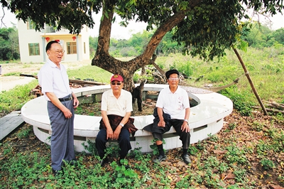 今年清明节期间,谢良青(左)、陈郑民(中)和梁杏新(右)在永安村的龙眼树下闲聊,追忆往事。